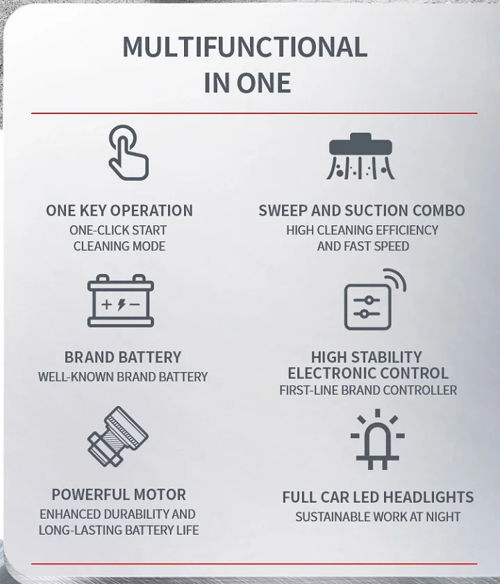 Xe quét rác S18F sở hữu bề rộng làm sạch 2000 mm, giúp gom và hút rác một cách nhanh chóng và hiệu quả. Được trang bị động cơ điện công suất cao và thiết kế tiết kiệm năng lượng, xe S18F phù hợp cho những khu vực yêu cầu vận hành liên tục và bền bỉ.