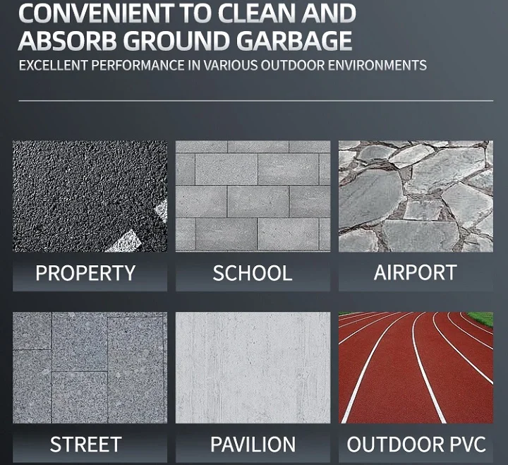 - Chổi chính dạng con lăn nằm ở giữa, kết hợp với hệ thống hút rác mạnh mẽ, đẩy rác vào thùng chứa dung tích 240 L, đáp ứng nhu cầu thu gom rác lớn mà không cần dừng lại để xả thùng thường xuyên.